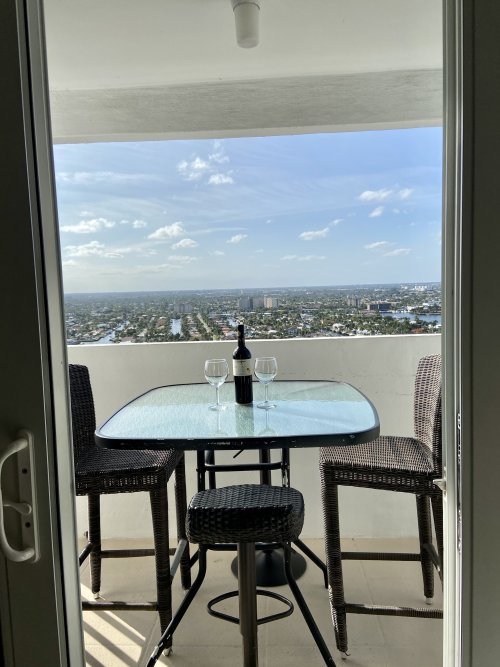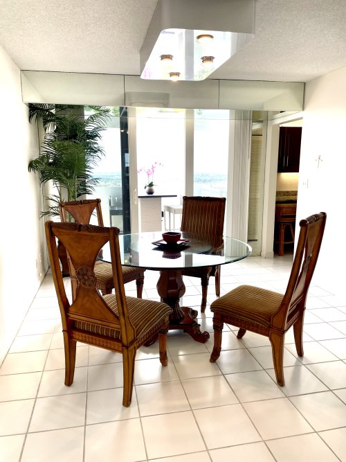 Condo de 1550 pc au 27e étage avec vue panoramique et coucher de soleil exceptionnelle. 2 balcons : un avec vue sur l’intercostal et le 2e avec vue sur la mer. Complètement meublé avec tous les électroménagés inclus : réfrigérateur, cuisinière, poêle, four micro-onde, lave-vaisselle, laveuse, sécheuse, cellier, etc. 2 chambres à coucher avec walk-in et 2 salles de bains completes. Salon, salle à manger et cuisine tout équipée. Système de climatisation et de chauffage central. Literie fournie. Bon pour maximum de 4 personnes durée minimale de 2 semaines. 3 950 $ par mois. Grande fenestration, très lumineux et insonorisation de qualité. TV, internet, Wifi, place de stationnement compris.