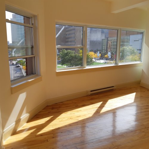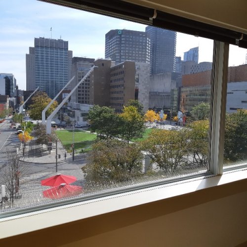Very sunny all day. In front of Maison Symphonique. Beautiful Panoramic View of downtown Montreal.