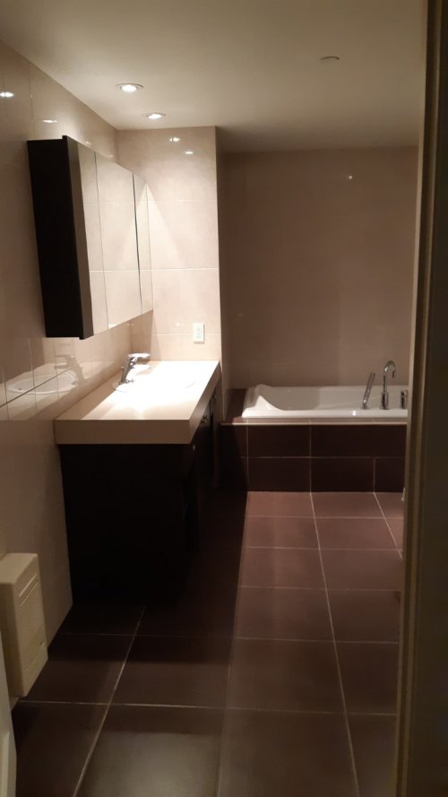 Large Bathroom in tiles with separate shower. Kitchen with wood cupboards, wall and floor in tiles.