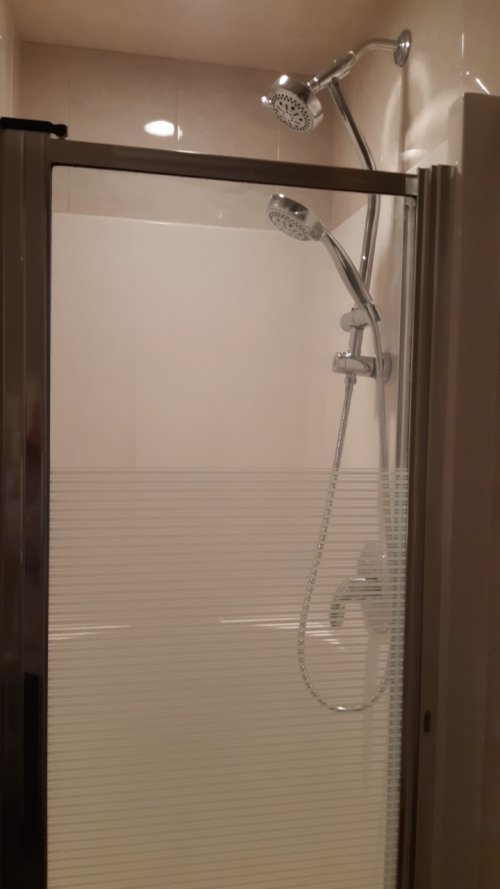 Grande salle de bain en tuiles avec douche séparée. Cuisine avec armoires en bois, beaucoup de rangement, plancher et mur en tuiles.